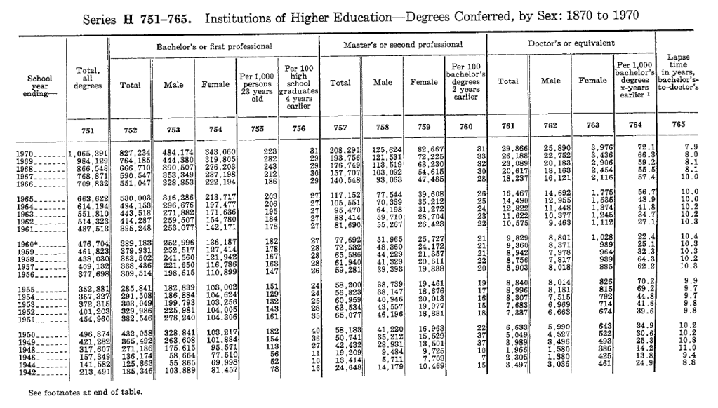 Already by 1965, the percentage of degrees given to women was 40% — this again omitting those women who dropped out after getting married. These women were not planning of having careers. They wanted to find a top-quality husband. It was common for men to seek the kind of woman who had a college degree. This still probably meant that she was from a better sort of family, and was both educated — really educated, in those days, not just credentialed — and had good self-discipline. She would make a good wife for the kind of man that has high aspirations for his own children.