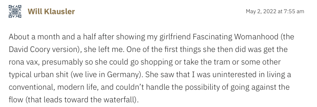 There are actually some women who are looking for a man who likes books like Fascinating Womanhood. Also, most of them are better looking than average. (No blue hair, tattoos, nose rings, and fewer fatties.) Some of them are total babes.