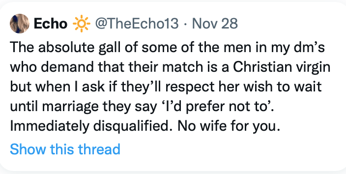 If men want to marry virgins, they are going to have to get used to marrying without sex first, or even kissing. This will require a sort of change of mindset.