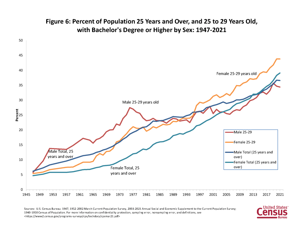 The recent levels — around 35% of men getting a bachelor’s degree — are about 50% higher than the previous long-term standard, around 23%.