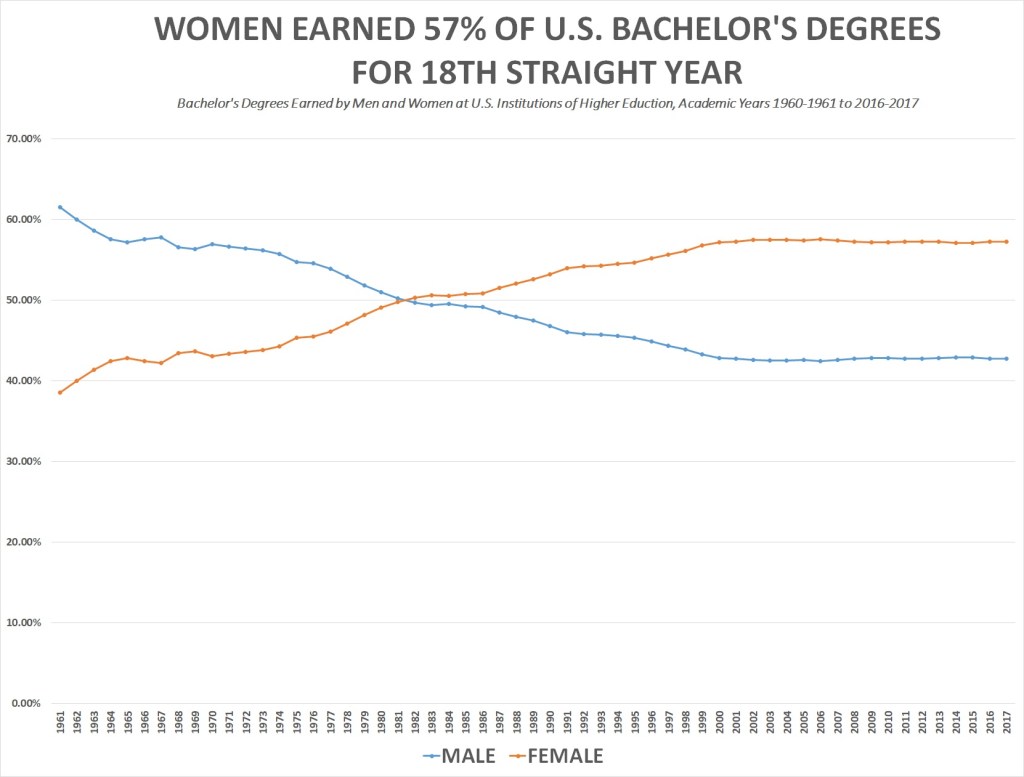 There’s a lot of wheezing these days that men are underrepresented in universities. Time to man up! But, actually, the percentage of men completing bachelor’s degrees is the highest ever.