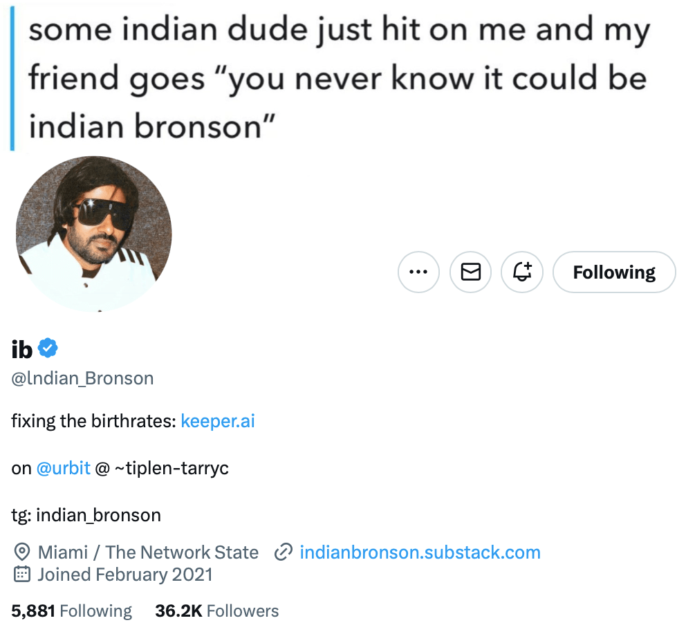 “Indian Bronson” on Twitter has been offering a steady flow of excellent insight. Apparently, this is part of his marketing strategy for a marriage-and-family-oriented dating/matchmaking service — keeper.ai