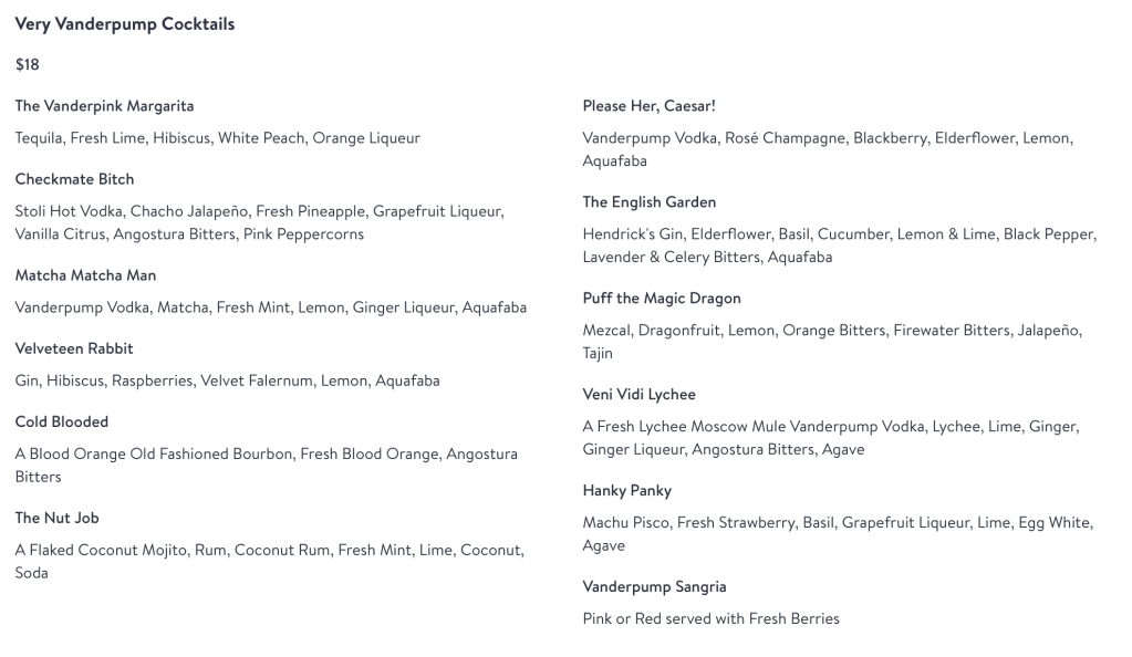 If I was in college again, and I had a girlfriend with $10,000 of dresses again, I would set up some formal cocktail parties. Suits, dresses and heels required. Establish a formal rotation of bartending duties among your guy friends. Make proper drinks, in pretty glasses. Here is the menu from the Vanderpump Cocktail Garden, at Caesar’s Palace, in Las Vegas — which is a nice place to drink cocktails. This is what I mean by “proper drinks.”
