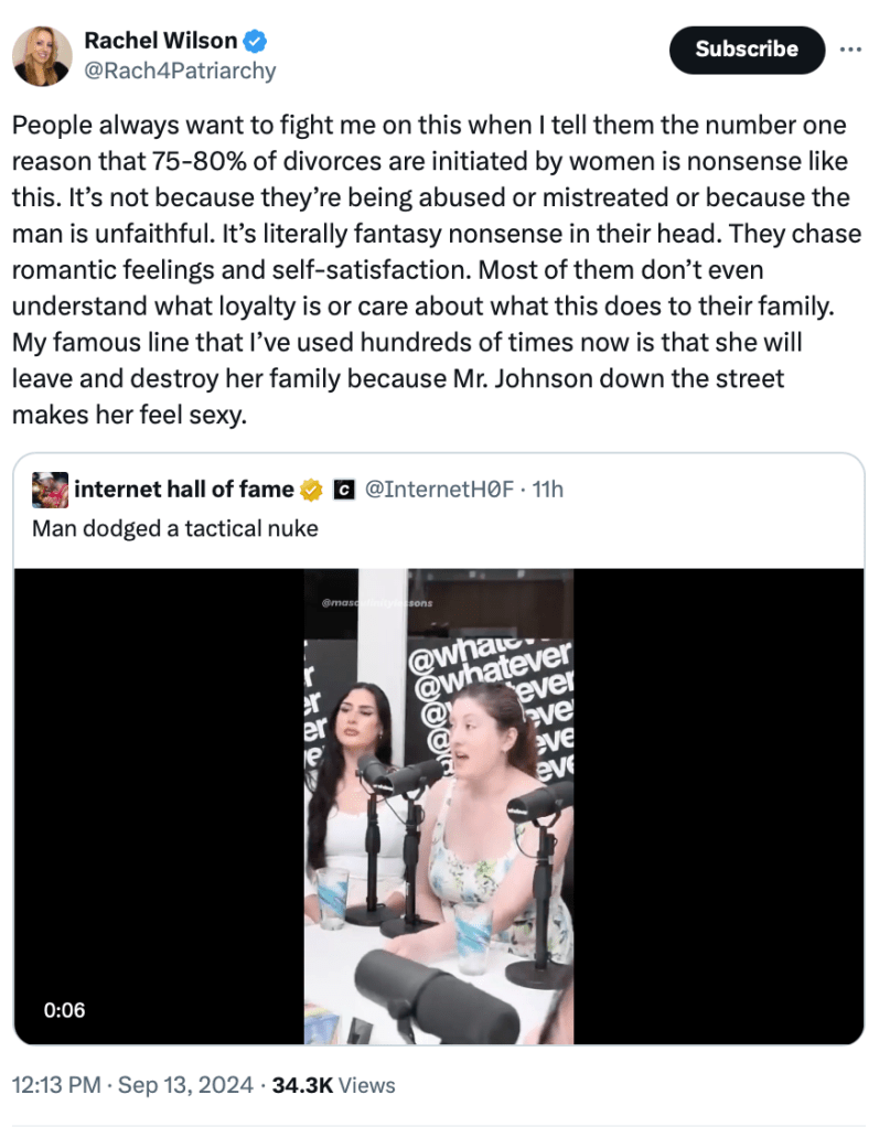 Now, she can leave, not come back, and the husband has to hand over all his property, and also a large portion of his income in the future, because of “muh feeeeelings!”