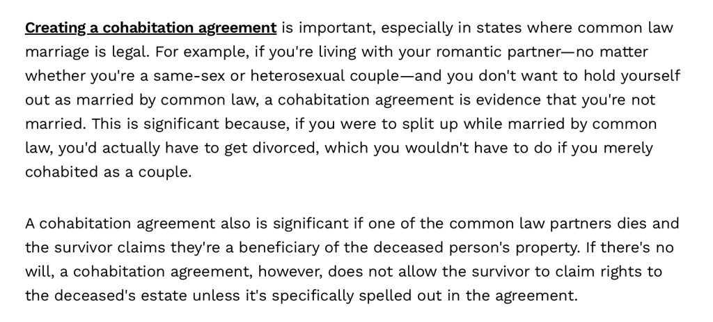 Apparently a Rental Agreement, even of $100 a month or $1, that is actually paid, will serve to cancel claims of Common Law Marriage in States that have Common Law marriage. Of course we actually want to be married, not “cohabitating” without marriage which I do not recommend. A man and a woman are married when they decide to be married, and act like married people. But, in the eyes of the law, you are not married, which is good because then they can’t skin you alive in divorce court.