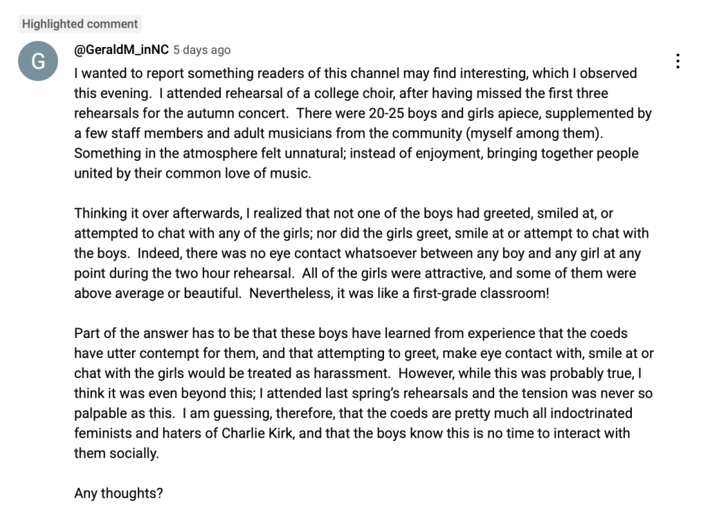 If I was a young person at a university today, I would buck this trend, and make a habit of talking with women (or men) regularly. We used to have dinner parties every Wednesday while in college. It was a constantly rotating mix of regulars and new faces. That’s what I would do, today.