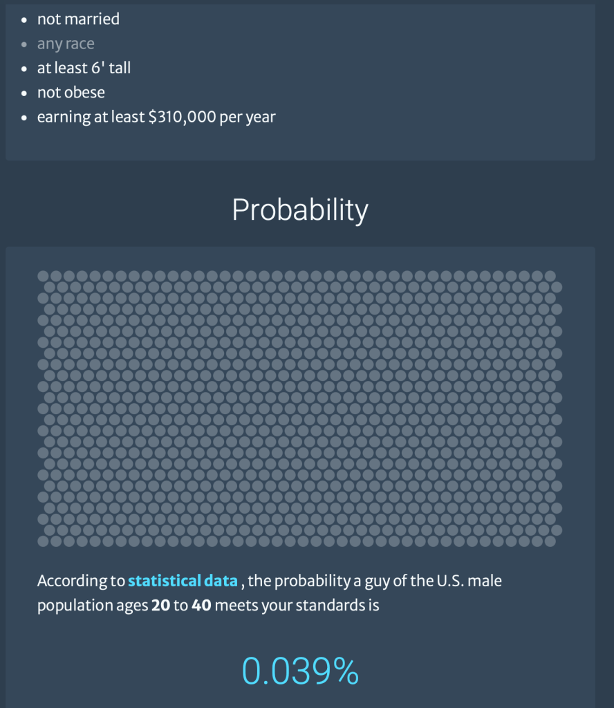 Nevertheless, after all this, and “settling” for someone merely upper-middle-class, a woman still has a 0.039% chance of getting the guy, right?